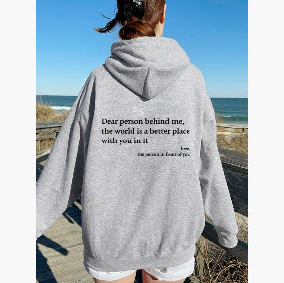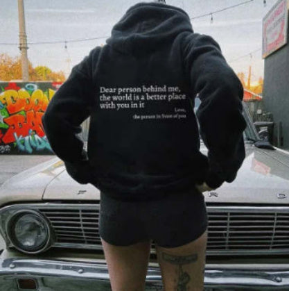 Opulent Comfort, Unparalleled Style Elevate your everyday with the Dear Person Behind Me The World Is A Better Place With You In It Love The Person In Front Of You Sweatshirt in a rich colors that speaks of refined luxury. Crafted for discerning shoppers, this top‑selling pullover blends couture-inspired silhouette with casual ease. A functional kangaroo pocket anchors the design, while a meticulously designed drawstring detail adds texture and customization. The fabric is premium polyester with a smooth, lasting finish, delivering a plush hand feel and elegant drape. Patterned with a subtle letters/numbers/text motif and a clean chest panel free of words, it exudes a sophisticated, fashion‑forward aura. The princess‑style line flatters the feminine form, making this piece as flattering as it is versatile.
