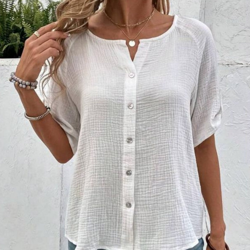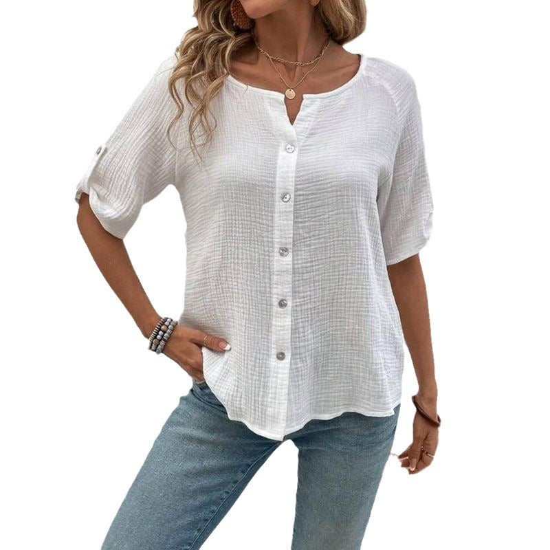 European And American Summer Women's Fashion Solid Color Short Sleeve Button White Shirt