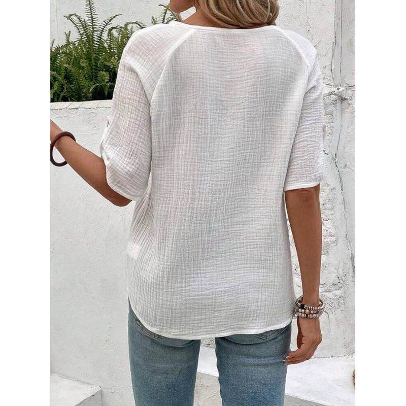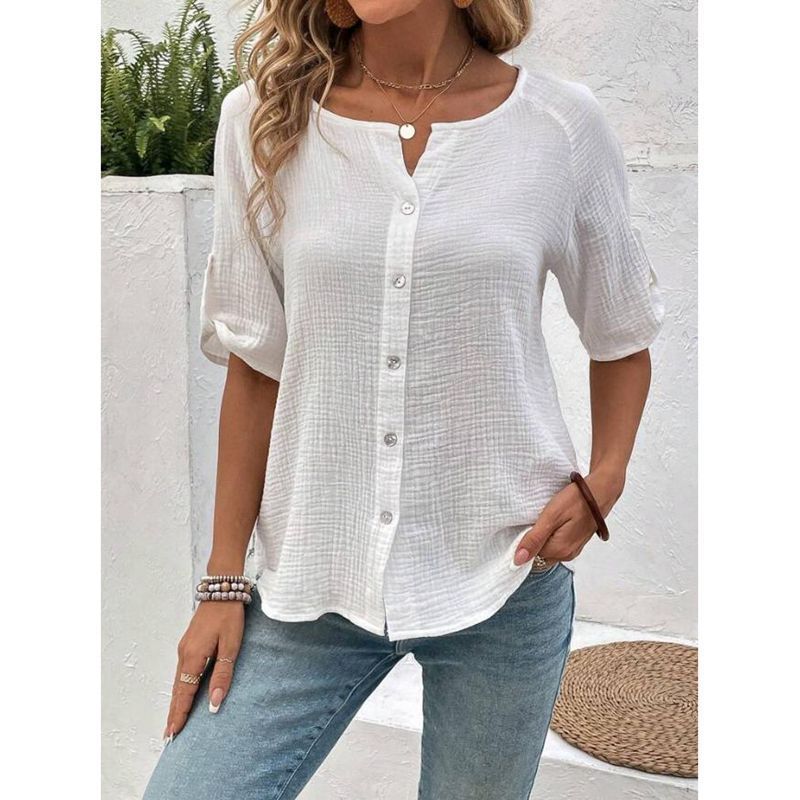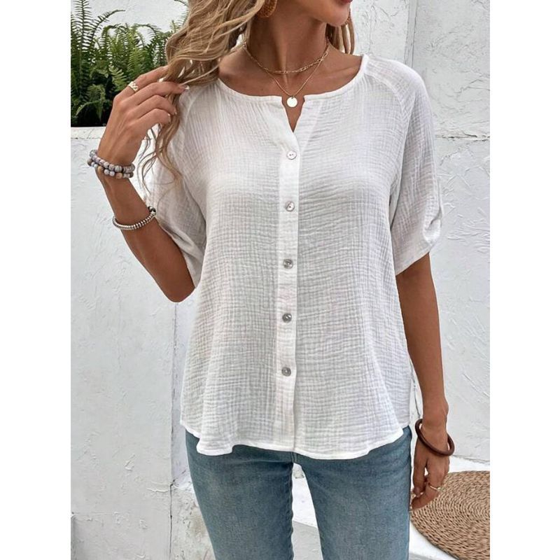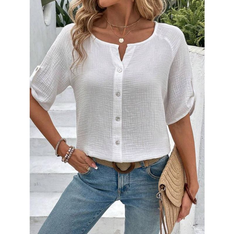 Experience unparalleled elegance with our European And American Summer Women's Fashion Solid Color Short Sleeve Button White Shirt, designed exclusively for those who appreciate refined style and timeless sophistication. This shirt embodies a unique blend of European and American fashion influences, making it a standout piece for any summer wardrobe.